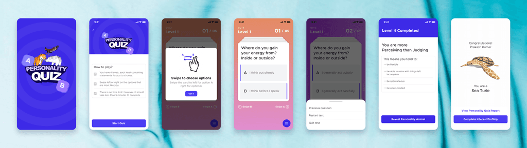 As the UI/UX Designer, my responsibility was to transform the quiz feature into a vibrant, engaging and interactive platform. Our vision was not just to finish the task accurately but to deliver the better career and education path to student based on their personality types.